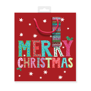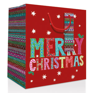 This bold & bright medium gift bag measures 20cm x 22.5cm and has red cord handles and a matching gift tag already attached for your convenience.