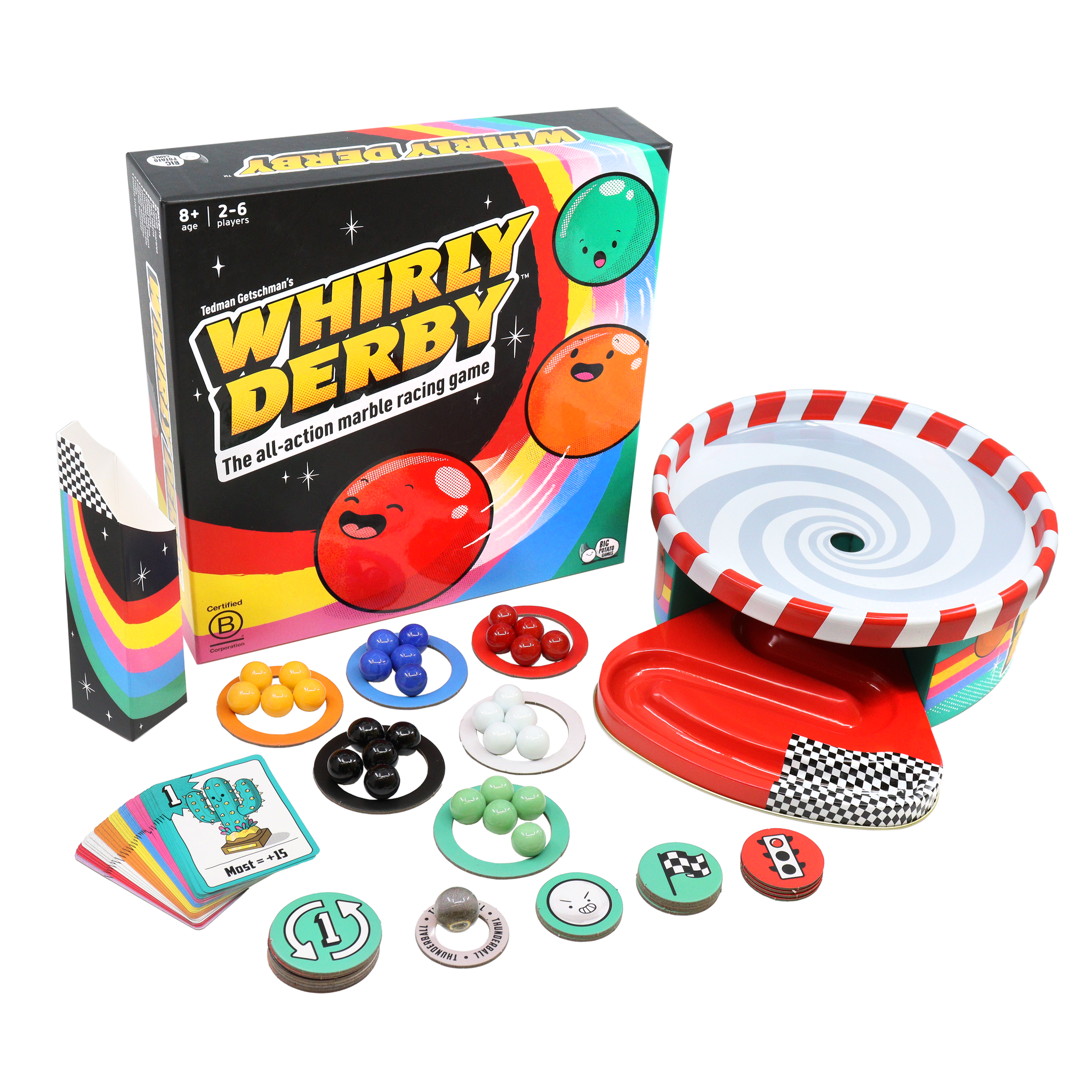 Whirly Derby is the all-action marble racing game where even the slowest gets an underdog bonus. Choose your colour and watch them swirl around the speedway. Once you’ve conquered the track, take the Advanced Rules for a spin!