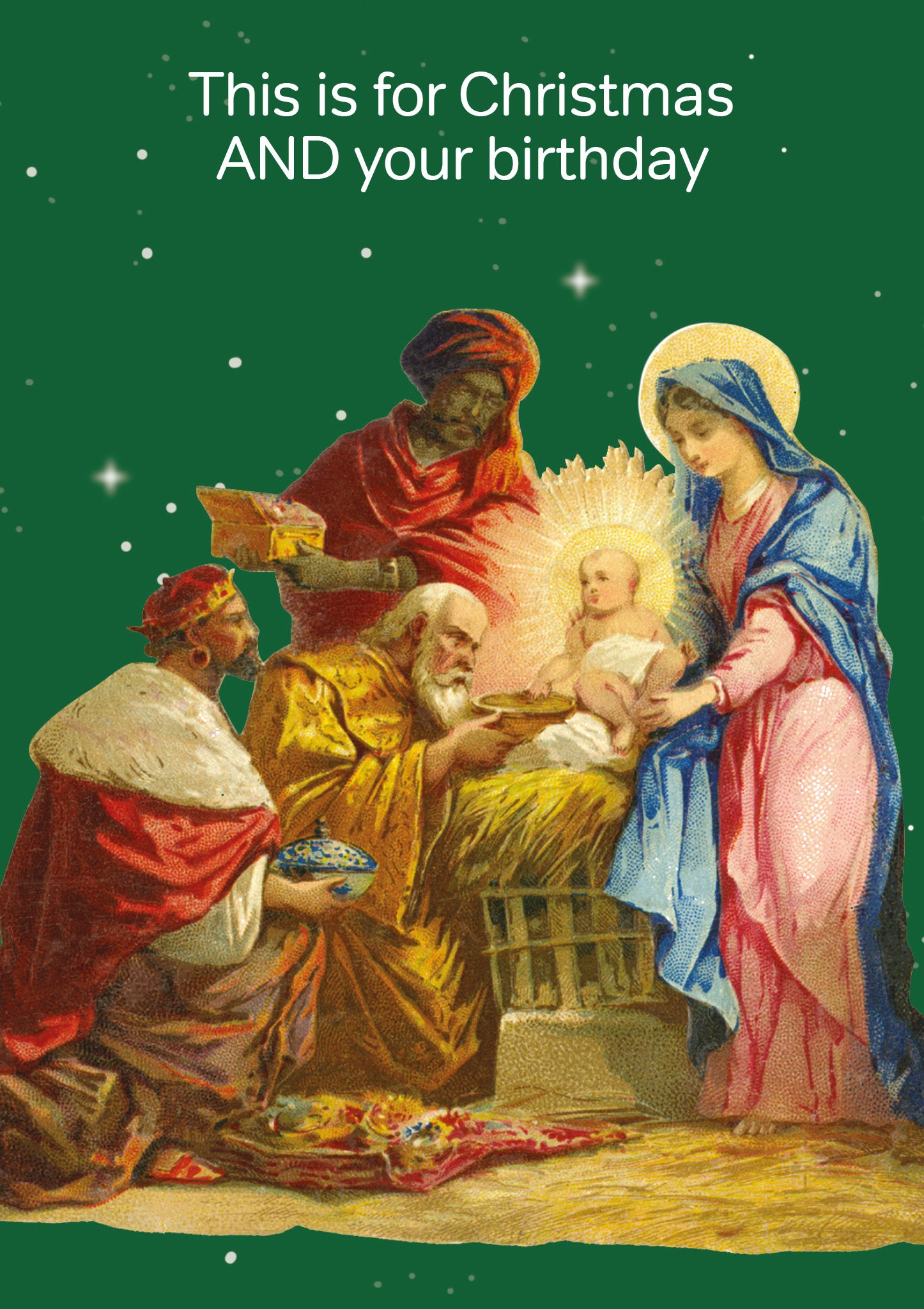 Share your pity for friends with a December birthday with this hilarious nativity Christmas card by Cath Tate. This quirky card is blank inside for you to add your own festive note.
