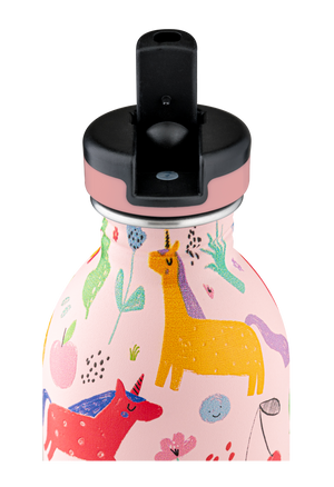 The sports lid has an integrated open-close straw and is 100% leakproof, allowing for comfortable drinking even with one hand. Featuring a magical unicorn-themed design, this 250ml water bottle is designed for the hands of little ones to drink water easily and on their own at home, school, clubs or the playground.