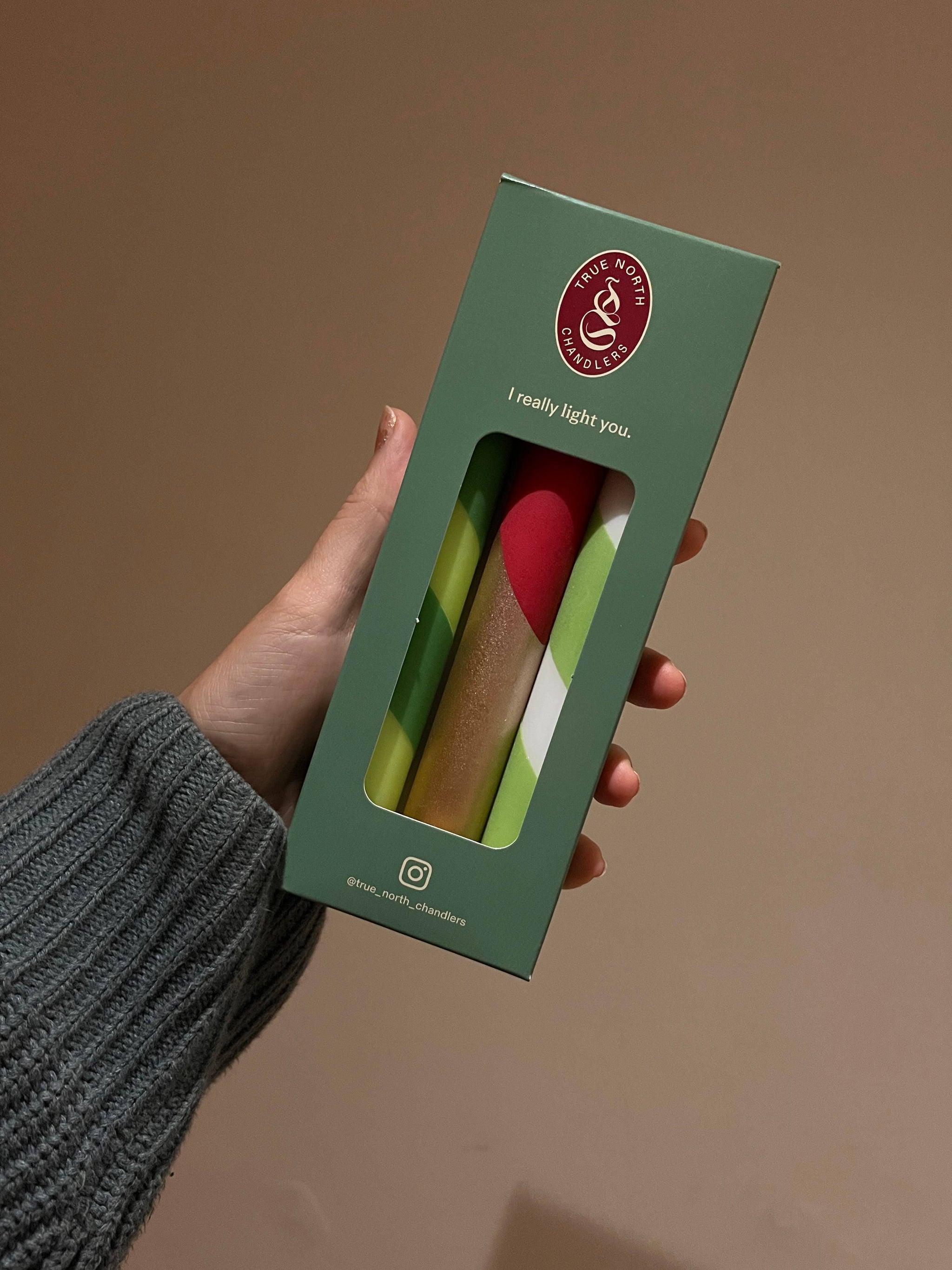 Hand decorated in Scotland, each set includes a white and sage striped candle, a red and gold candle and a bright and dark green striped candle. Measuring 19cm high with a 2.3cm diameter, these furiously festive dinner candles are made from 100% Stearin wax which is the most sustainable candle you can get north of the equator! Whatsmore, stearin has a higher melt point than other waxes - so it burns brighter, longer and is smoke and drip free!