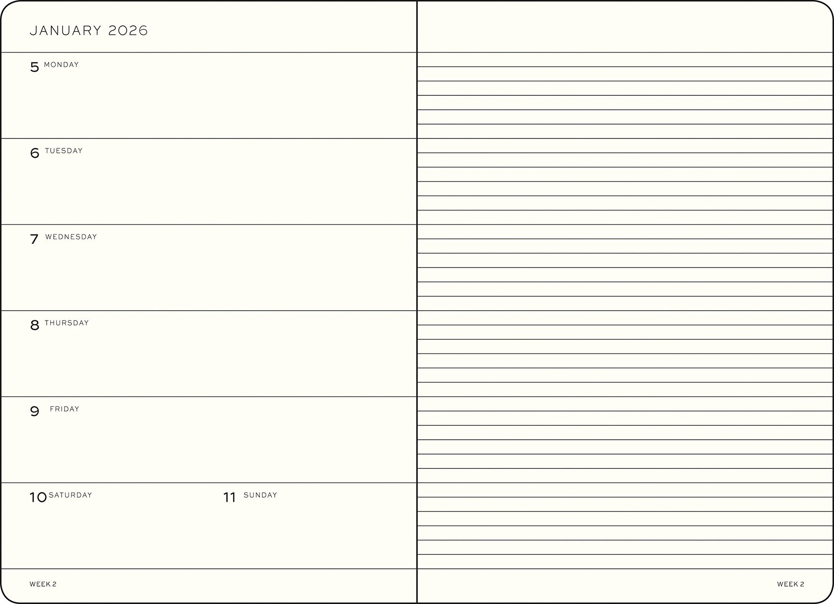In this medium-sized (A5) 18 month planner, each double page features one page with the full calendar week on the left and a lined notebook page on the right. Running from 1 July 2026 to 31 December 2027, there are overview sections for 2026, 2027 and 2028.